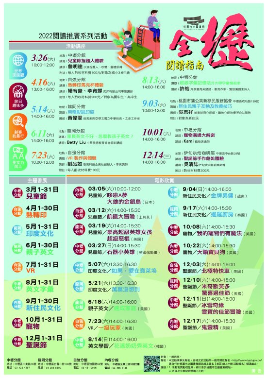 各場次講座於辦理前一個月開放報名,請至桃園市立圖書館網頁