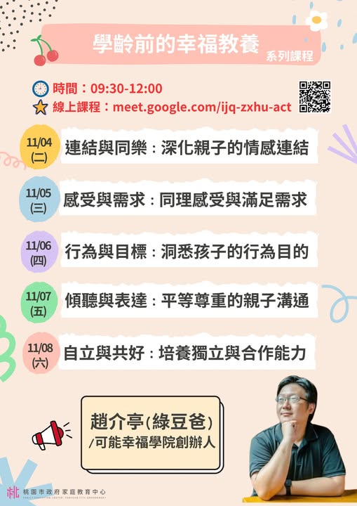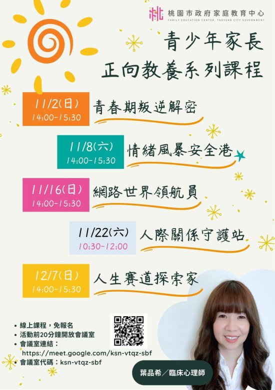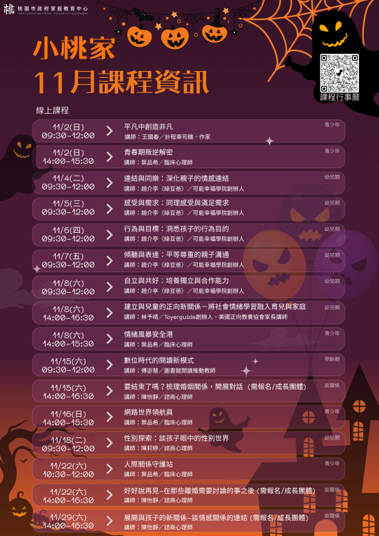 二、 旨揭課程詳細資訊,請見中心課程行事曆(https://reurl.cc/xlGyGL)或追蹤「桃園市政府家庭教育中心」FB粉絲專頁;另倘有家庭教育個別化服務需求,可撥打4128185家庭教育諮詢專線,本市市民可申請小桃家線上諮詢室(預約連結:https://reurl.cc/oZWOY5),由中心媒合專業人員透過線上會議室提供服務。